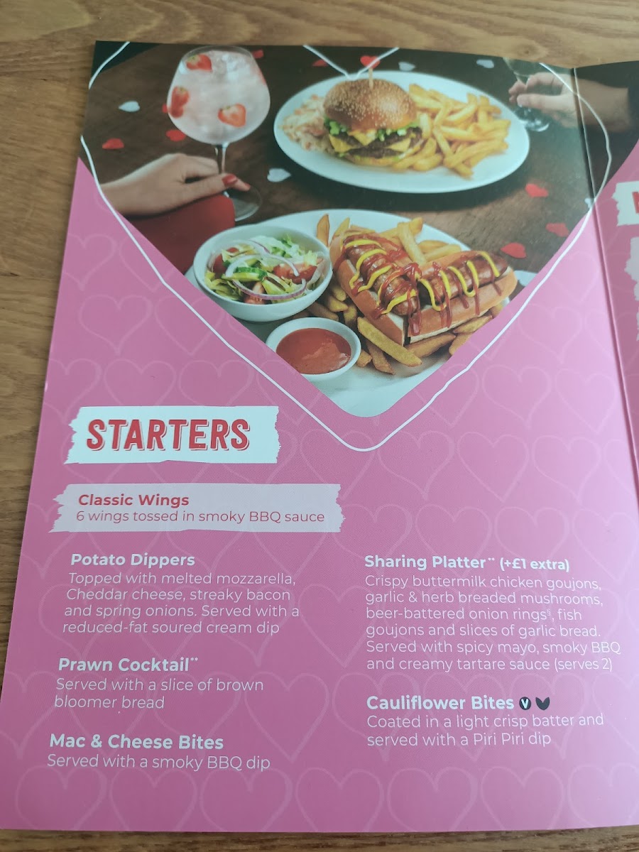 Crispy chicken goujons, garlic and herb breaded mushrooms, beer-battered onion rings§, mac & cheese bites and slices of garlic bread. Served with spicy mayo, reduced-fat soured cream and smoky BBQ sauce (1,721kcal, serves 2, 861kcal per serve)