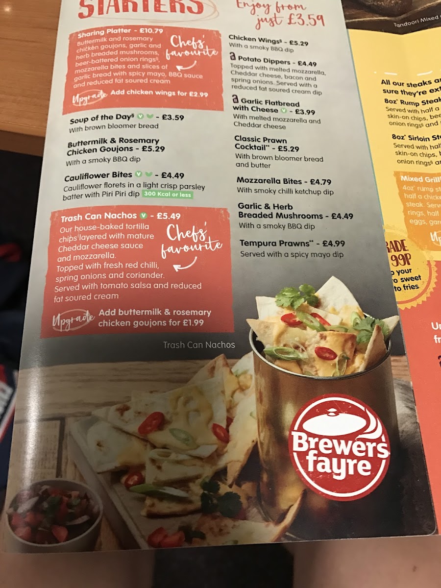 Crispy chicken goujons topped with Cheddar cheese and streaky bacon. A gammon steak topped with pineapple and Cheddar cheese and a 4oz* rump steak topped with a fried egg. All served with skin-on chips, beer-battered onion rings§, coleslaw and a s...